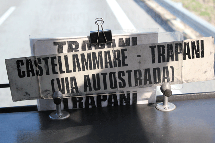 Alles läuft wie am Schnürchen, der Flieger landet in Birgi, ich nehme den Bus nach Trapani, sehe dieses Schild und frage: “Ach, fährt der Bus nach Castellammare del Golfo weiter?”, “Ma, si! Non conviene scendere. Aussteigen lohnt nicht!” Doch wo in Castellammare muss ich denn überhaupt hin? Piazza Petrolo! Kennt der Busfahrer nicht, aber einer der gefühlt 100 zugestiegenen Schüler. “Zeig Du ihm den Weg!” “OK.” Dort angekommen sagt Francesco: “Ich rufe mal meinen Vater an, der fährt Dich dahin!” Grazie Domenico.